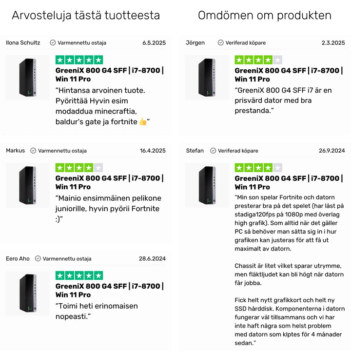 Tämä GreeniX 800 G4 SFF on fiksu ostos sinulle, joka haluat sujuvan pelikokemuksen ilman uuden laitteen hintalappua. Yritysluokan runko, Intel Core i7 -suorituskyky ja täysin uusi GeForce RTX 3050 6 GB -näytönohjain tekevät siitä nopean, hiljaisen ja luotettavan pelikoneen vuosiksi. Säästät rahaa, saat paremman hinta–laatu-suhteen ja pelaat huoletta, koska kone on kunnostettu toimimaan kuin uusi ja toimitetaan valmiiksi käyttökuntoon Windows 11:llä.