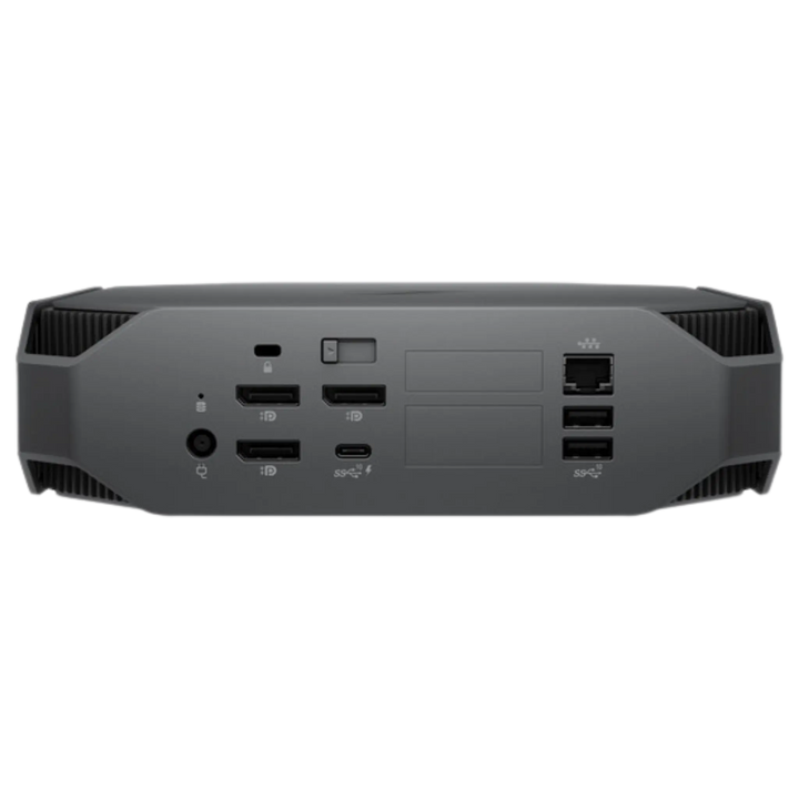 - Liitännät (takana): 2 × DisplayPort 1.4 kahdelle näytölle, 2 × USB-A 10 Gbps lisälaitteille, 1 × RJ-45 verkolle.